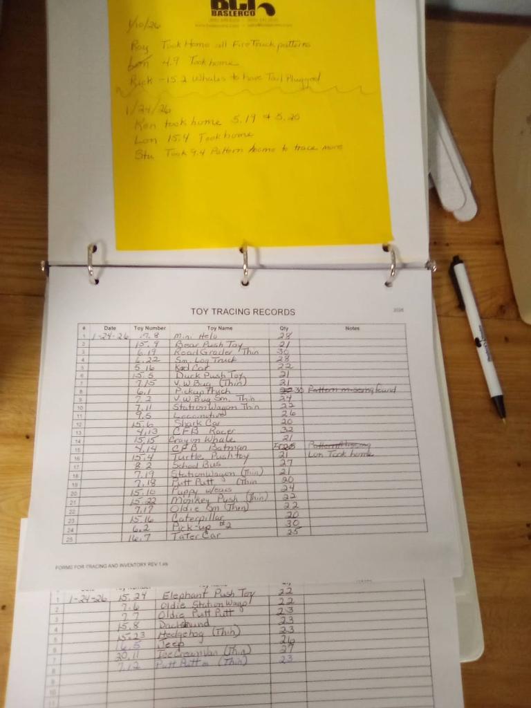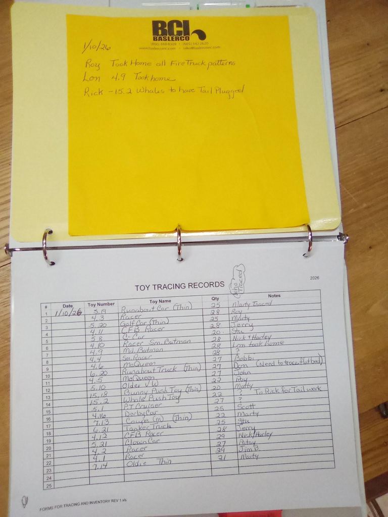 A “Prep for Tracing” Team met today to make ready all the Patterns to be traced for 2026 Toys. We will be tracing toys for at least the next four workshops. We prepared about 70 patterns for 2×4 stock and 35 patterns for 1 inch stock which covers the majority of the toys planned for 2026. We will start cutting as soon as a few patterns have been traced. Hope to see you this weekend!